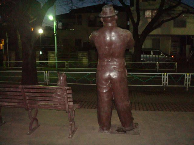 この「なぜか上半身裸でラッパを吹くオッサン像」