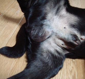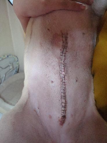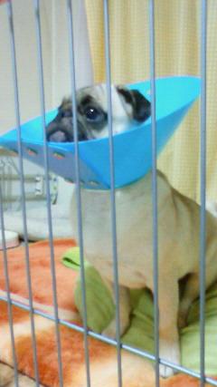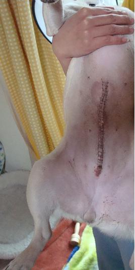 縫合箇所から漿液が少し出ている為、包帯の腰巻をしている。
