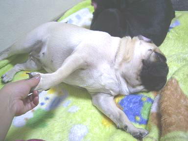パグの尻尾はクルリンと丸まってるから、手で伸ばしてもすぐに