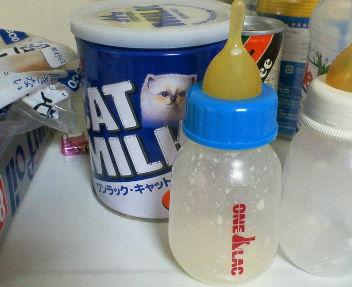 哺乳瓶後ろにあるミルクはなぜかネコ用。