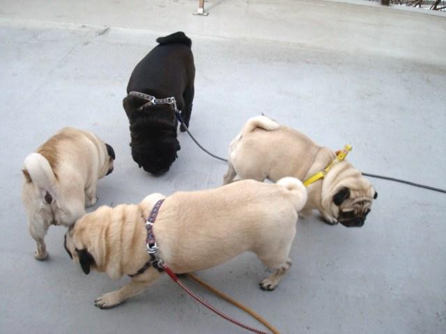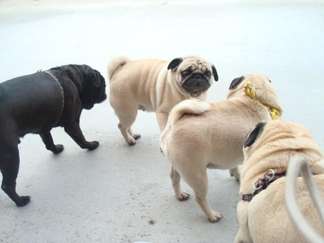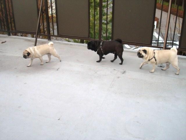 到着した先で遠慮なく走り出す我が家のパグ達